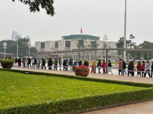 In the tradition of Vladimir Lenin they preserved him, and put him on display. We joined a long line of people that led to a one-man mausoleum where Uncle Ho lay in state, guarded by four motionless soldiers standing with rifles, clothed in dress white uniforms. Vietnamese are mostly short people but all of these guys were over six feet tall.