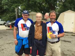 My father-in-law Pete Reilly has lived in Ames for decades, where he’s been a biochemical engineering professor at Iowa State. Now he’s dying of cancer. He loves RAGBRAI, though only in concept because he’s never done it and has never wanted to. But he came out to see our camp and see to me. Pete was pale, bent and frail. He had just stopped using chemotherapy on his intestinal cancer because it had made him sick in so many ways. He would enter hospice soon.